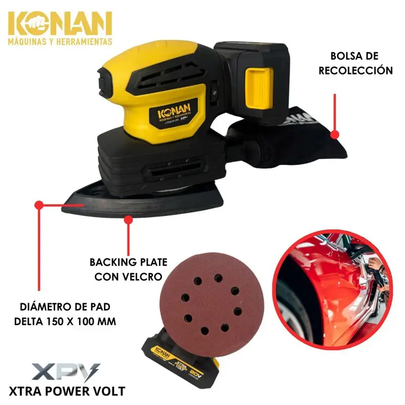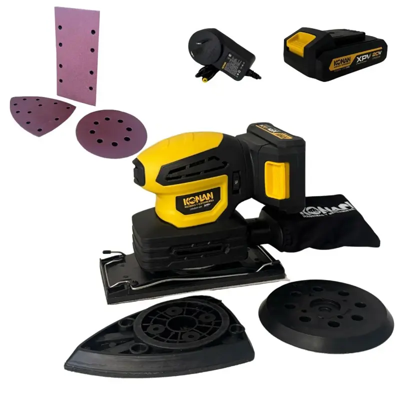 La Multilijadora 3 en 1 a Batería 20V Xtra Power Volt Konan modelo KLP3120V es la solución ideal para quienes necesitan una herramienta multifunción, práctica y potente para trabajar sobre distintas superficies y en diversas aplicaciones. Gracias a su sistema de cabezales intercambiables, permite adaptar la forma de lijado a cada necesidad, logrando acabados prolijos y precisos, tanto en grandes superficies como en detalles y esquinas.