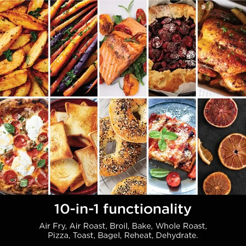 Funcionalidad 10 en 1: incluye 10 programas de cocción versátiles: freír al aire, asar al aire, asar, hornear, asar entero, pizza. Tostadas, bagel, recalentar, deshidratar.