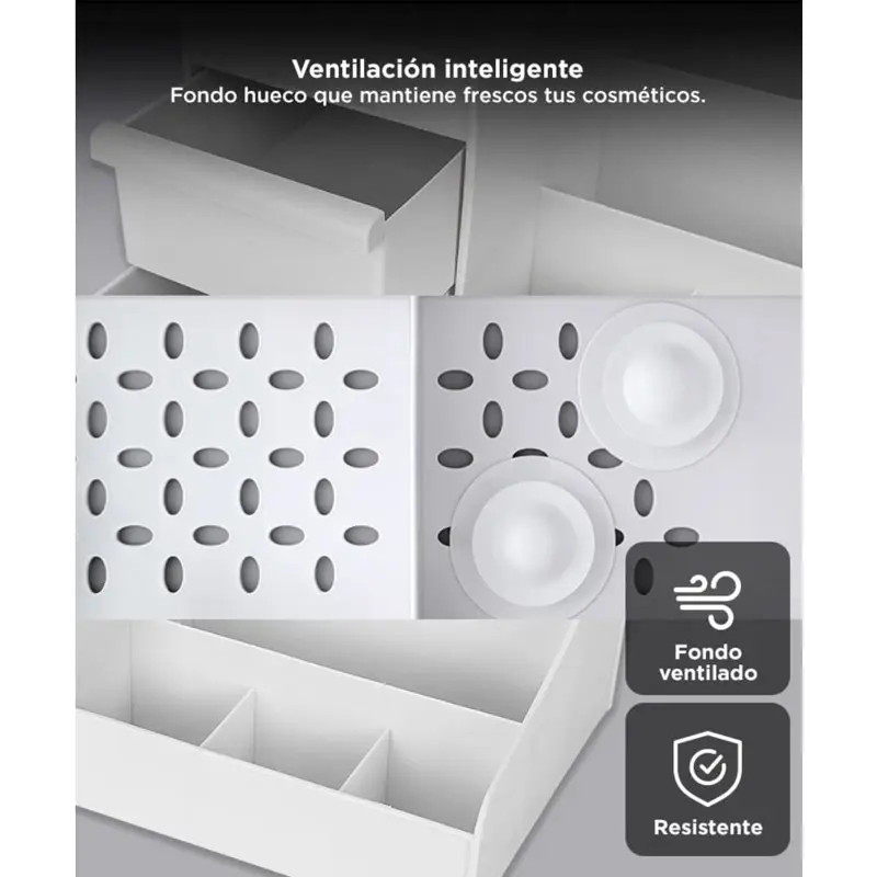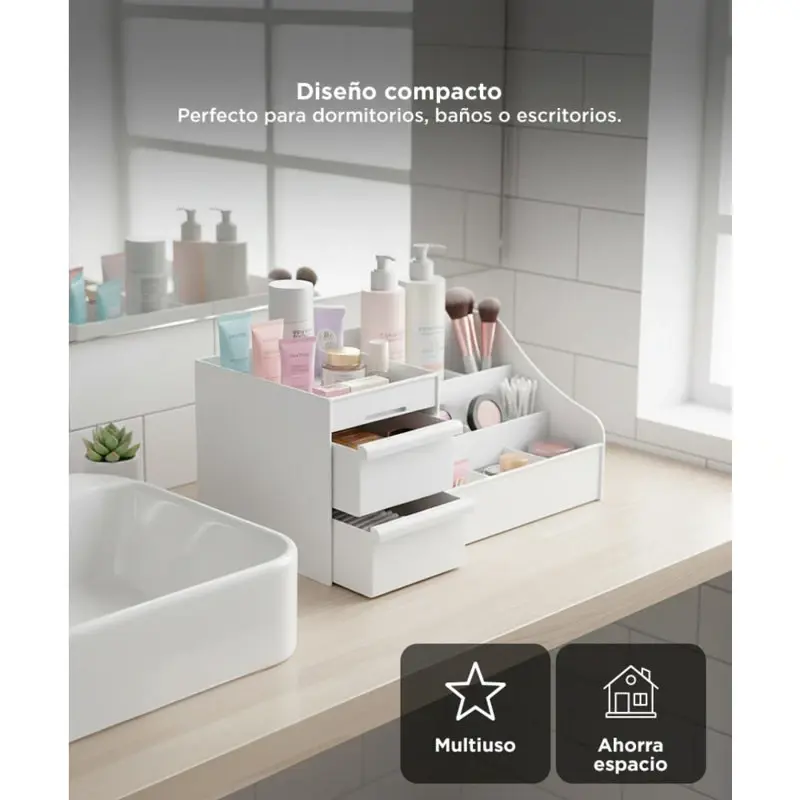 Acerca de Organizador de Maquillaje Gadnic con Cajones Descubrí la elegancia y eficiencia con nuestro Organizador de Cosméticos. Diseñado para adaptarse a tus necesidades cambiantes, este organizador es tu compañero perfecto para mantener tus productos de belleza perfectamente organizados. Los siete compartimentos espaciosos y los dos cajones deslizantes ofrecen una variedad de opciones de almacenamiento, desde botellas de crema hasta brochas y delineadores, manteniendo tus productos grandes y pequeños al alcance de tu mano. El diseño incluye un fondo hueco para ventilación, lo que garantiza que tus productos se mantengan en condiciones óptimas, evitando la humedad y el calor que podrían dañarlos con el tiempo. La personalización es clave: organiza tus productos de belleza según tus necesidades diarias, sin búsquedas interminables. Hecho con materiales de alta calidad, nuestro organizador no solo es funcional sino también elegante. Encaja perfectamente en cualquier decoración de baño, oficina o escritorio. Mantené tus cosméticos bien organizados y siempre al alcance con estilo. Simplifica tu rutina de belleza diaria y redescubre la belleza que te rodea. No pierdas más tiempo buscando tus productos de belleza. Haz tu pedido hoy y disfruta de la belleza y la organización. Especificaciones Compartimentos: 7 Cajones: 2 Versátil: Si Fondo hueco para ventilación: Si Tamaño: 33,5*22*16CM Material: PP