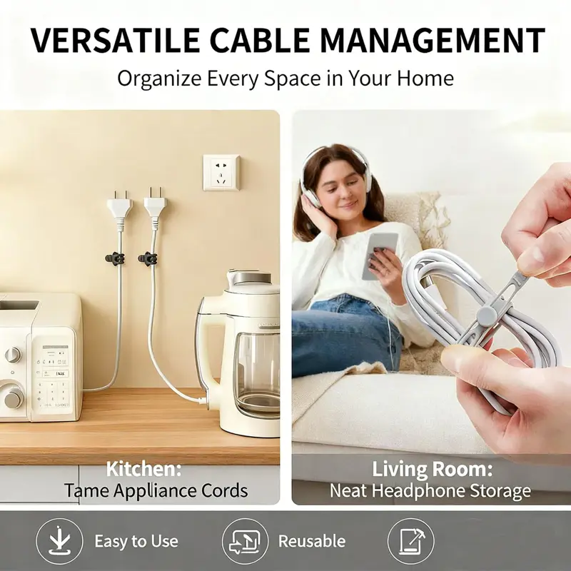 Disponibles en cinco colores distintos — negro, blanco, gris, rosa y verde matcha — estos organizadores ayudan a identificar y separar fácilmente diferentes cables para una mejor organización. Más allá del manejo de cables, su versatilidad se extiende a agrupar diversos objetos del hogar como bolsas de alimentos, cortinas y paraguas, convirtiéndolos en un accesorio multifuncional para el uso diario.