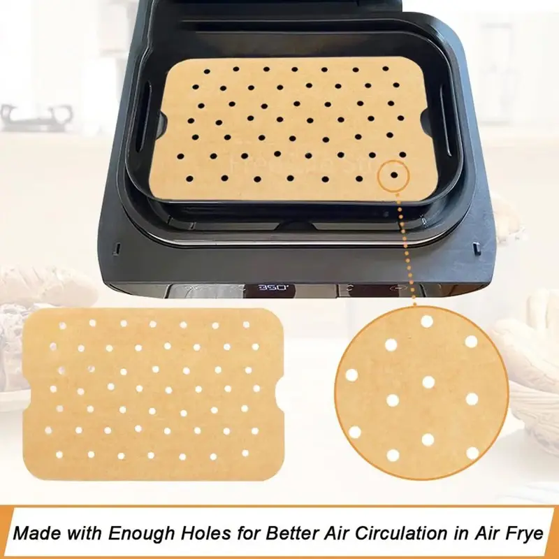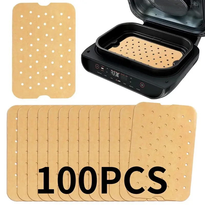 Revestimientos de papel pergamino para freidora de aire compatibles con Ninja Foodi FG551. Medidas de 11,6 x 7,6 pulgadas, ajustables a diferentes tamaños. Fabricados con pulpa de calidad alimenticia, son antiadherentes, impermeables y a prueba de aceite. Resisten temperaturas de hasta 232°C, facilitando la cocción y conservación de alimentos sin afectar su sabor. Incluyen perforaciones que mejoran la circulación del aire en la freidora. Disponible en paquetes de 50 o 100 unidades, en colores marrón o blanco. Se recomienda cubrir al menos dos tercios del papel con alimentos durante el uso para evitar daños.
