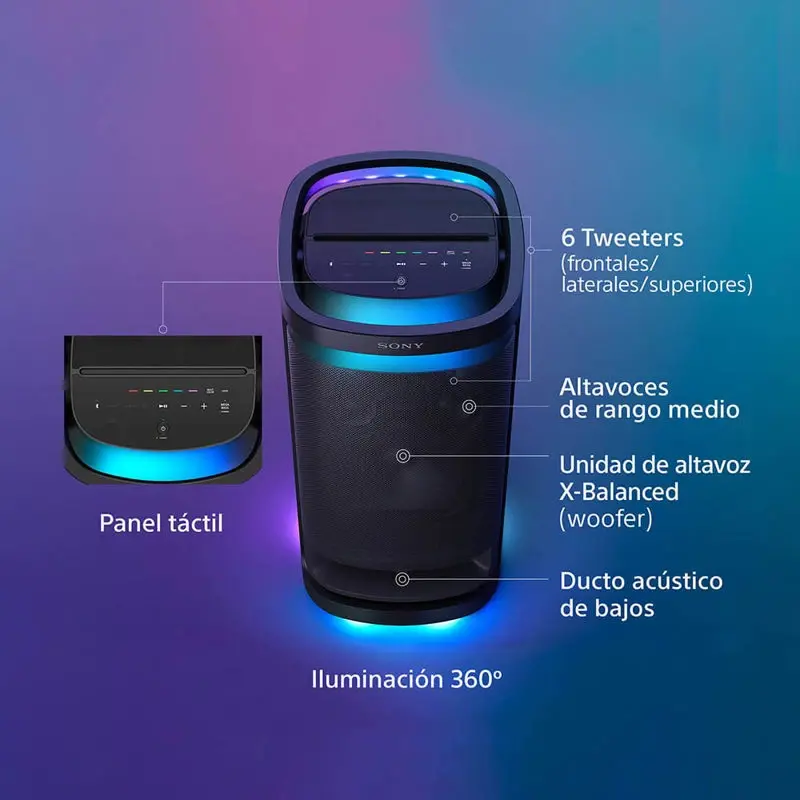 Tienda Oficial Sony Argentina Parlante Portátil Bluetooth inalámbrico Sony SRS-XV900 Características principales: El nuevo XV900, con la mayor presión sonora de la gama de altavoces inalámbricos de Sony y una enorme duración de batería de 25 horas, está siempre listo para la fiesta. Sonido de fiesta omnidireccional Siente el sonido en cada rincón gracias a seis tweeters en las partes delantera, lateral y trasera que aumentan la claridad. Asa y ruedas Cuando quieras mover el altavoz, usa la cómoda asa de transporte e inclínalo hacia atrás. Las resistentes ruedas te permitirán transportarlo con facilidad hasta el lugar de la fiesta. Karaoke y guitarra Conecta un micrófono, elige una canción y saca el artista que llevas dentro. Gracias a una segunda entrada, hasta puedes conectar una guitarra para usar el altavoz de amplificador. Sostenibilidad Objetivo de neutralizar la huella medioambiental. X-Balanced Speaker Unit Incorpora un diafragma casi rectangular que crea una mayor superficie. Iluminación de fiesta omnidireccional La luz indirecta produce iluminación ambiental en todas direcciones para que puedas iluminar la sala como se adapte mejor a tu estilo. Control y conectividad Contrólalo todo con el panel táctil superior: cambia de modo y controla los ajustes y la iluminación con un toque. 25 h de duración de batería El XV900 animará la fiesta durante toda la noche. Refuerzo de sonido de TV Disfruta de un mejor sonido de los contenidos audiovisuales, como los vídeos de actuaciones en directo y las películas. Gracias a los graves profundos y a la propagación realista del sonido de alta frecuencia, podrás disfrutar de una auténtica experiencia audiovisual que te sumerge en todo lo que ves. Aplicaciones móviles Optimiza tu altavoz con Sony l Music Center, Fiestable, Google Play y el App Store. ____________________________ ESPECIFICACIONES » Sonido Tipo de parlante: 4 vías, bass reflex » Modos de sonido: Clear Audio+, LIVE SOUND, MEGA BASS, TV Sound Booster » DSEE: Sí » EQ personalizada: 3 bandas » Dimensiones (An. x Al. x Pr.): Aprox. 410 mm x 880 mm x 439 mm » Peso: Aprox. 26,6 kg » Sistema de comunicación: Versión 5.2 » Alcance de comunicación máximo: Aprox. 30 m » Perfiles compatibles: A2DP, AVRCP, SPP » Códecs compatibles: SBC, AAC, LDAC » Alcance de transmisión de frecuencia: 20 Hz