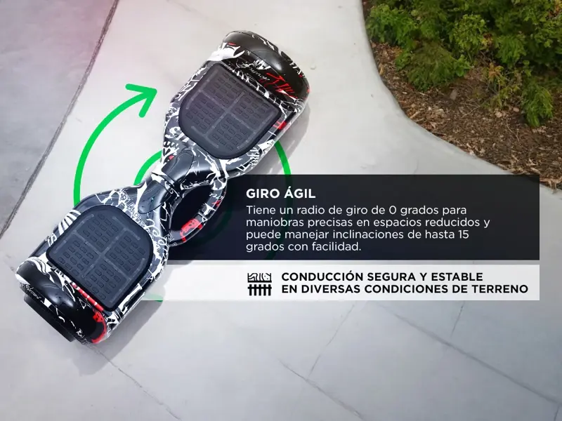Capaz de soportar una carga máxima de 100 kg y superar inclinaciones de hasta 15 grados, esta hoverboard es ideal para una amplia gama de usuarios. Su radio de giro mínimo de 0 grados permite maniobras precisas en espacios reducidos, brindándote una agilidad sin precedentes.