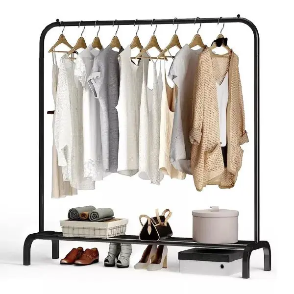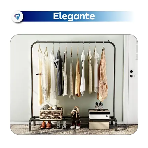 | Material | Estructura metálica (acero) con acabado negro resistente; barras metálicas para colgar prendas; plataforma inferior para zapatos |