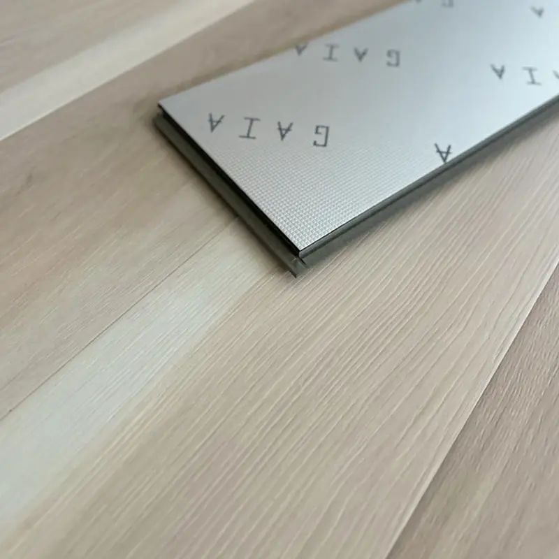 Esta compuesto por fibras de madera de alta densidad (HDF) pegadas y herméticas. La textura se alinea y combina perfectamente con la madera representada en el piso. El relieve coincide con la capa visual: se ve y se siente como madera real.
