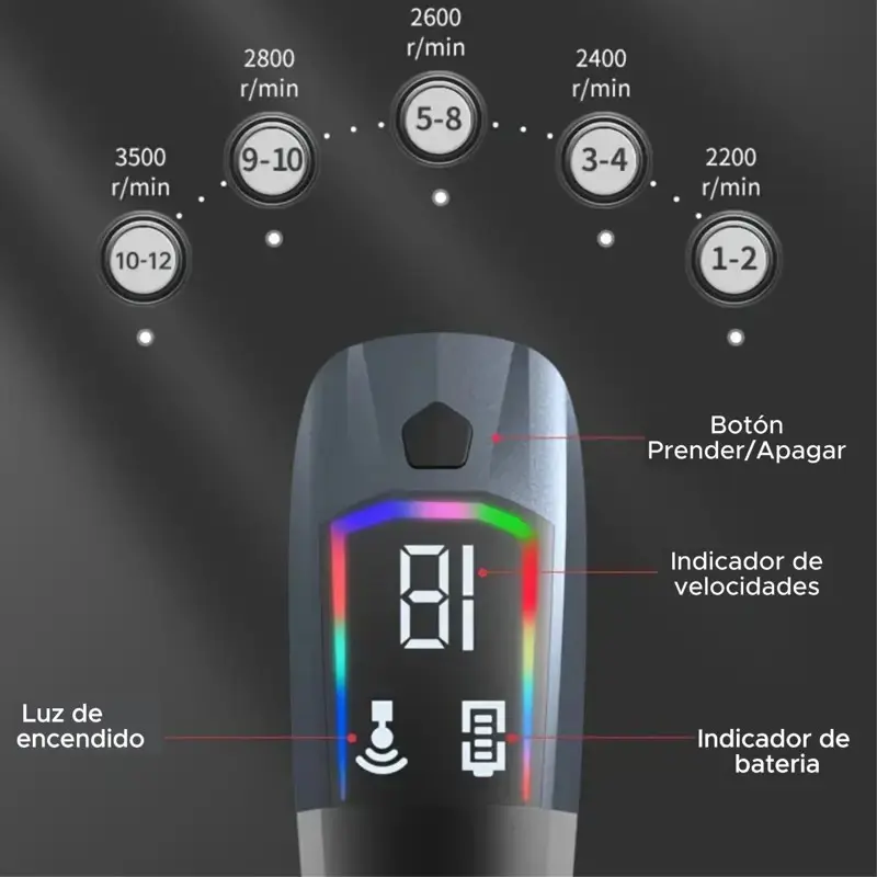 * 12 NIVELES DE VELOCIDAD regulables que se manejan de forma práctica y sencilla. Podes seleccionar una velocidad para cada necesidad de tratamiento