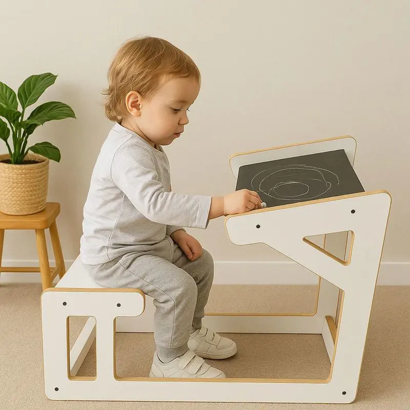 Fabricada en melamina, ofrece durabilidad y facilidad en la limpieza, perfecta para cualquier entorno infantil. Incluye accesorios como tiza, lo que permite a los niños expresarse artísticamente y desarrollar habilidades motrices mientras aprenden a dibujar y escribir.