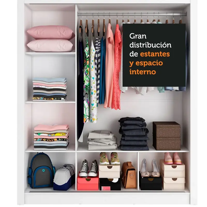 Total aprovechamiento interior teniendo en cuenta el uso de dos personas. Posee muchos nichos que facilitan la organización de ropas, zapatos y accesorios. El tubo de la percha es muy resistente y tiene espacio para ropa larga.