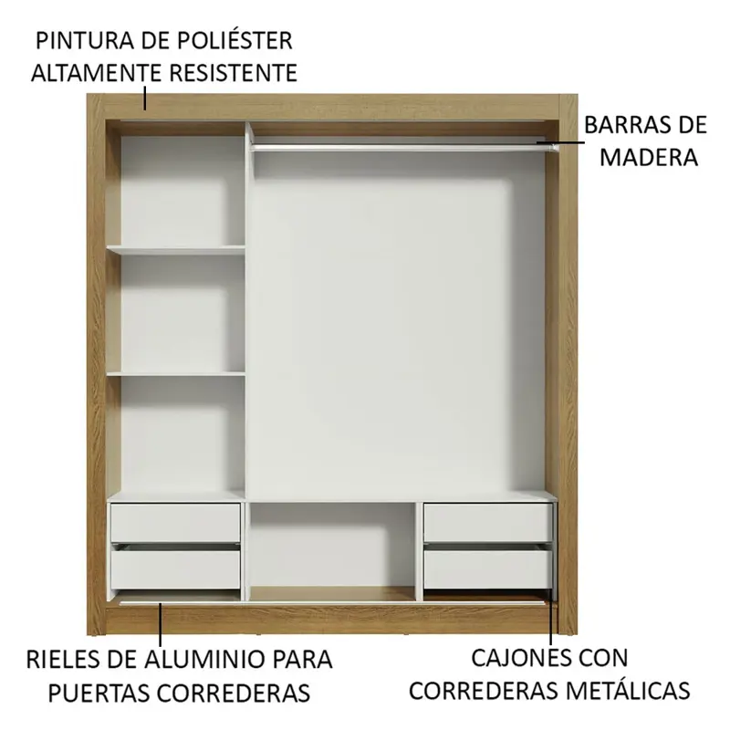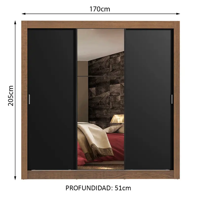 El Placard con el mejor costo beneficio del mercado. Herrajes de calidad, una puerta con espejo, perchero metálico, cuatro cajones y acabado de alta resistencia que aporta durabilidad y resistencia.Las puertas corredizas cuentan con riel superior e inferior de aluminio y un sistema de deslizamiento suave que garantiza un mejor funcionamiento. Uso interno total teniendo en cuenta el uso de dos personas.Esta versión cuenta con cuatro cajones internos con correderas metálicas, varios nichos que facilitan la organización de ropa, zapatos y complementos. El tubo perchero es muy resistente y tiene espacio para ropa larga.Todos los muebles poseen un acabado de alta resistencia exclusivo de Madesa. Este método es totalmente ecológico y además protege y conserva los muebles durante mucho más tiempo. Toda la madera utilizada proviene de bosques renovables.Medidas totales:- 205 cm de alto- 170 cm de ancho- 51 cm de profundidadArtículos incluidos:- Cuatro (4) cajones internos- Un (1) perchero metálico grande- Tres (3) estantes que suman cuatro (4) nichos- Tres (3) puertas corredizas, dos (2) de madera con dos (2) manillas de aluminio y una (1) con espejoCódigo del producto:- 1093091E4G Blanco- 10939B1E4G Blanco/Marrón- 1093731E4G Blanco/Negro- 10935Z1E4G Marrón- 10936E1E4G Marrón/Blanco- 10937K1E4G Marrón/Negro- 10938N1E4G Negro- 1093771E4G Negro/Blanco- 1093D81E4G Negro/MarrónNota:- Imágenes únicamente ilustrativas.- La decoración no acompaña el producto.- Madesa no proporciona servicio de ensamble.- Incluye un manual con código QR para el ensamble.- El producto viene con toda la tornillería necesaria para el ensamble.
