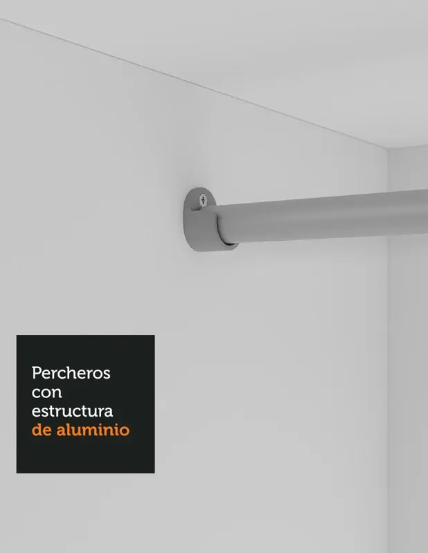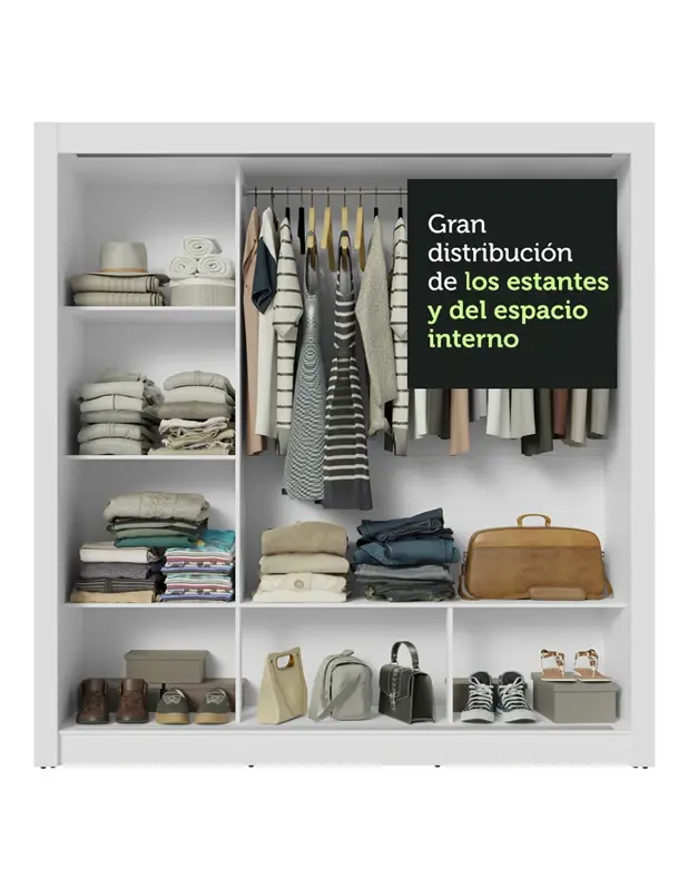 Total aprovechamiento interior teniendo en cuenta el uso de dos personas. Posee muchos nichos que facilitan la organización de ropas, zapatos y accesorios. El tubo de la percha es muy resistente y tiene espacio para ropa larga.