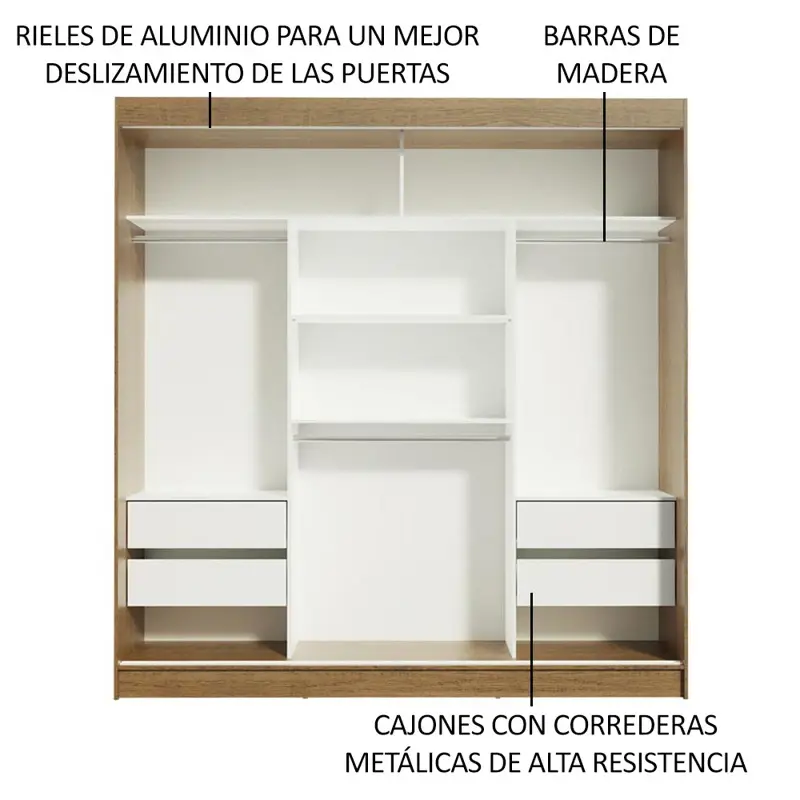 Son tres puertas corredizas con rieles de aluminio y deslizamiento suave, que optimizan el espacio de la habitación, sin estorbar al abrir. Además, la puerta central cuenta con espejos que amplían la estancia y resultan muy prácticos para el día a día.