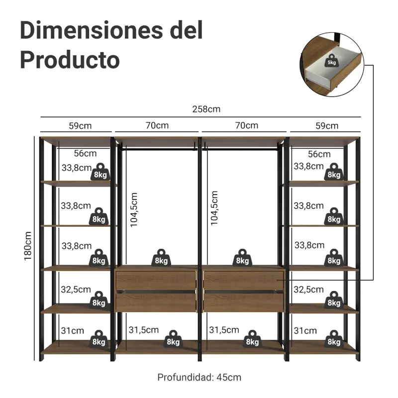 El Placard Modulado Valencia de Madesa es una solución innovadora para optimizar el espacio y facilitar la organización de su habitación. Su estructura abierta fue diseñada para ofrecer fácil acceso a sus objetos en el día a día. En esta versión, posee cuatro piezas independientes con dos bastidores metálicos, varias repisas amplias y cuatro cajones espaciosos. Todos los muebles poseen un acabado de alta resistencia exclusivo de Madesa. Este método es totalmente ecológico y además protege y conserva los muebles durante mucho más tiempo. Toda la madera utilizada proviene de bosques renovables.Medidas totales: - 180 cm de altura - 258 cm de ancho - 45 cm de profundidad Elementos incluidos: - Dos (2) Muebles de 59 cm de ancho con (5) repisas cada uno- Dos (2) Muebles de 70 cm de ancho con dos (2) cajones cada unoCódigo del producto: MDDR0400017K Marrón/NegroNota:- Madesa no ofrece servicio de ensamble.- Las imágenes son únicamente ilustrativas.- Por seguridad, es obligatorio fijar el mueble a la pared.- Posee estructuras laterales en MDP con pintura en negro texturizado.- Acompaña piezas y manual con todos los pasos para el ensamble del producto.