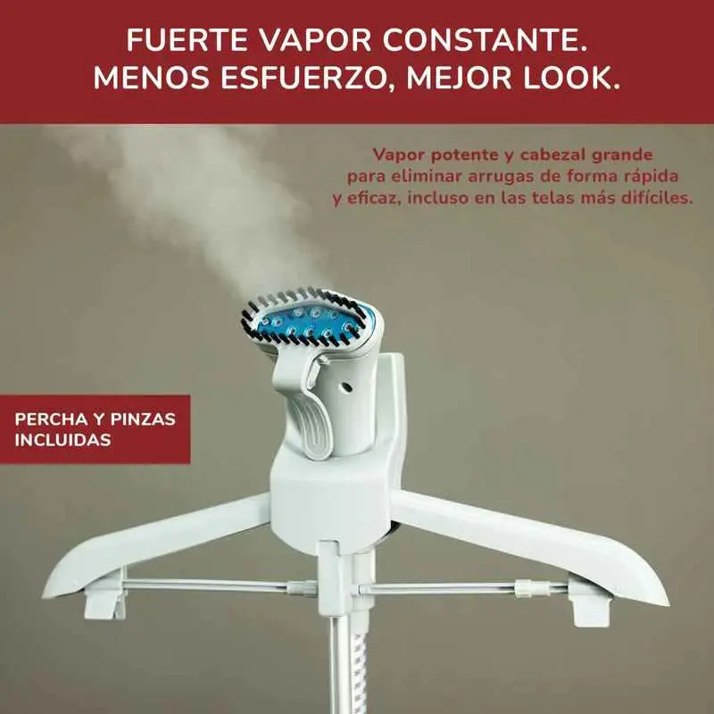 El vapor regulable en 2 niveles se adapta perfectamente a todo tipo de telas —desde las más delicadas hasta las más gruesas—, mientras que la manguera flexible y la altura ajustable en 3 posiciones brindan total comodidad durante el uso.