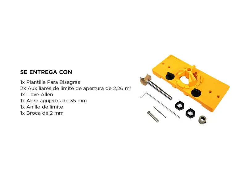 Acerca de Plantilla Para Bisagras Cazoleta 35mm Nueva Plantilla Para Bisagras Cazoleta 35mm! La plantilla se adapta perfectamente a las bisagras cazoleta estándar de 35mm, asegurando un ajuste ideal para tus proyectos de carpintería. Fabricada con materiales resistentes y duraderos, nuestra plantilla garantiza una larga vida útil y un rendimiento consistente en cada uso. Su diseño intuitivo y fácil manejo hacen que incluso los proyectos de bricolaje sean más sencillos. La plantilla incluye instrucciones detalladas para una instalación sin complicaciones. Adecuada para una variedad de aplicaciones, desde la instalación de puertas en el hogar hasta proyectos más extensos de carpintería. La versatilidad de esta plantilla la convierte en una herramienta indispensable. Especificaciones Material: Acero inoxidable, plástico Apto para bisagras: 35 mm Anillo de límite Broca de 2 mm