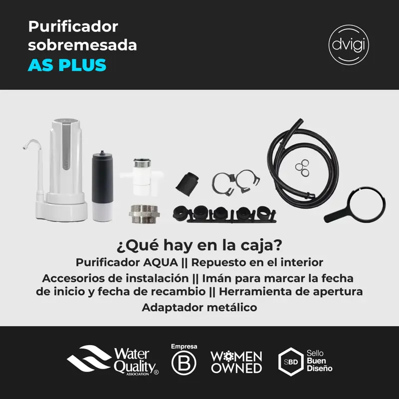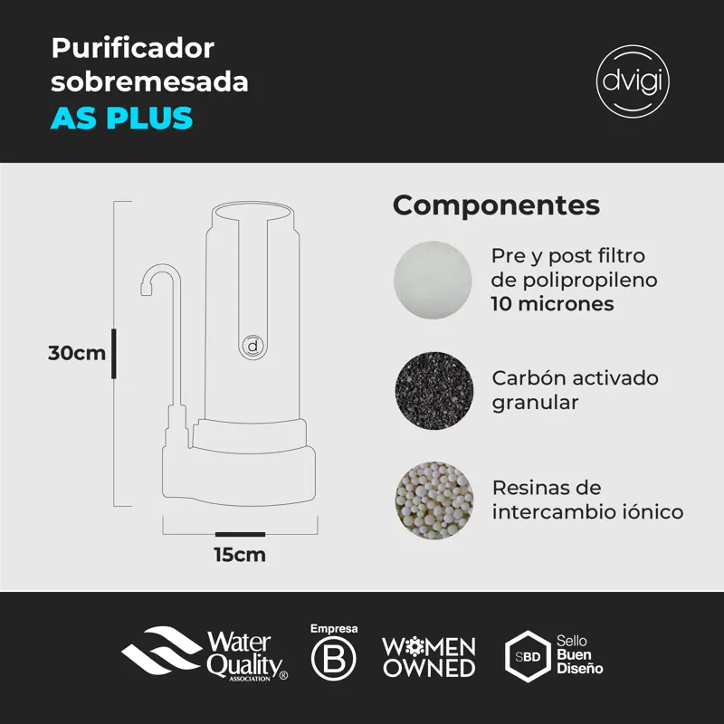 Filtro Purificador de Agua AS PLUS + 2 filtros adicional DvigiTecnología:Nuestra tecnología combina carbón activado, resinas de intercambio iónico y un filtro de polipropileno, eliminando cloro, compuestos orgánicos, químicos y sedimentos. Reduce el arsénico a menos de 0,01 mg/L y también disminuye metales pesados como plomo, cadmio y níquel, garantizando un agua más pura y segura.Qué sustancias retiene: Elimina cloro, turbidez y sedimentosFiltra arsénico y metales pesados como plomo, cobre y aluminioMejora el sabor y olor del aguaQué incluye:Dispositivo Purificador de Agua modelo AS PLUSUnidad filtrante preinstalada1 unidade filtrantee adicionalesKit de instalaciónQR con el manual de usuarioColores disponibles: blanco o negro, con detalles en dorado o plateadoCertificación:Certificación ANMAT (RNE No: 020035271 | RNPUD No: 0250005)ISO 9001Especificaciones técnicasMedidas: 30 cm de alto x 15 cm de diámetroMateriales: pre y post filtro de polipropileno, carbón activado y resinas de intercambio iónicoGarantía DVIGICon más de 35 años de experiencia, DVIGI ofrece una garantía de 2 años en todos sus productos. Además, contamos con atención postventa personalizada para ayudarte en todo momento.