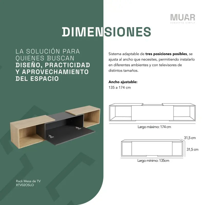 Rack flotante con 3 posiciones de ancho ajustable (de 135 cm a 174 cm).