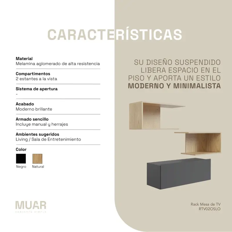El rack flotante RTV02 es la solución ideal para quienes buscan practicidad, diseño y aprovechamiento del espacio. Con un sistema adaptable de tres posiciones posibles, se ajusta al ancho que necesites, permitiendo instalarlo en diferentes ambientes y con televisores de distintos tamaños. Su diseño suspendido libera espacio en el piso y aporta un estilo moderno y minimalista.