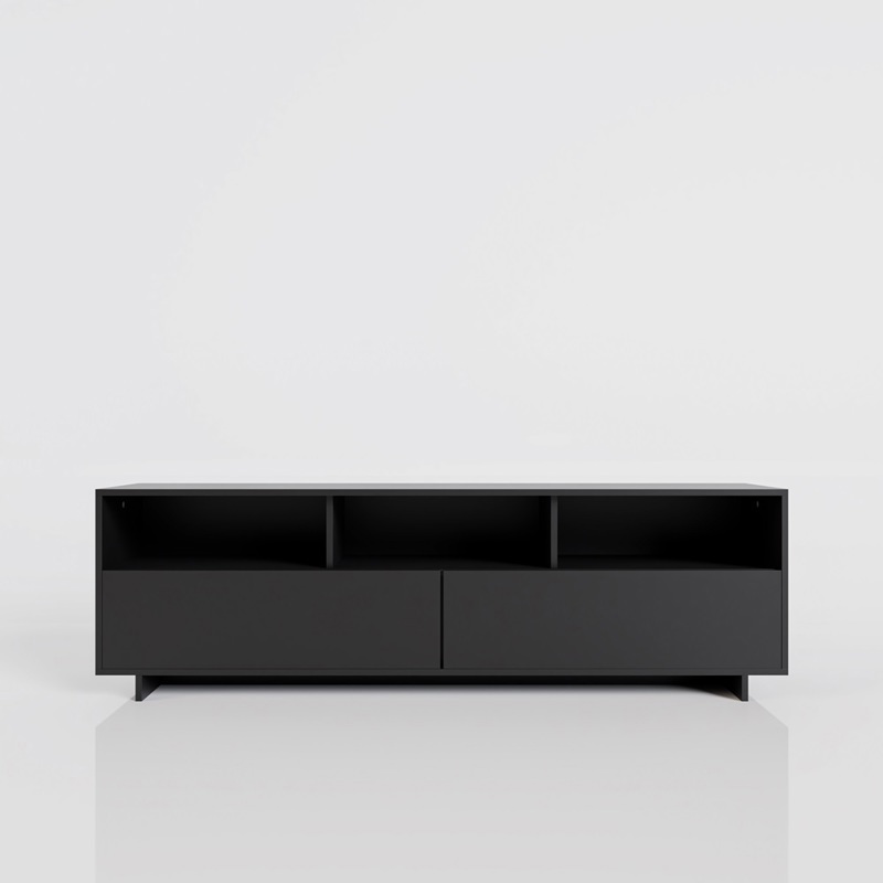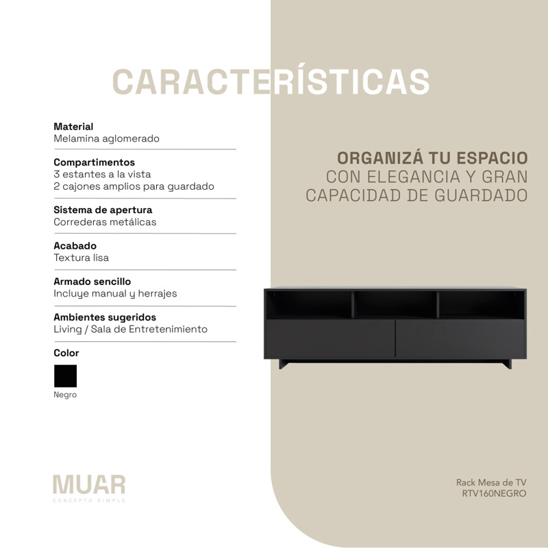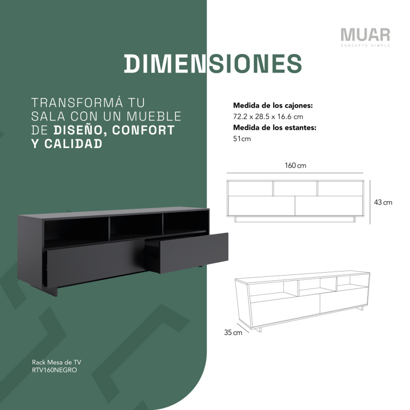 Nuestro Rack de TV cuenta con 2 Cajones y 3 Espacios de Guardado, completando nuestra línea de muebles de diseño y confort. Su interior es de melamina de primera calidad, moderno, con 160 Cm de largo, tres espacios de guardado y 2 cajones de apertura con correderas metálicas. Posee espacios abiertos que funcionan como estantes, donde podés colocar tus objetos electrónicos o adornos.