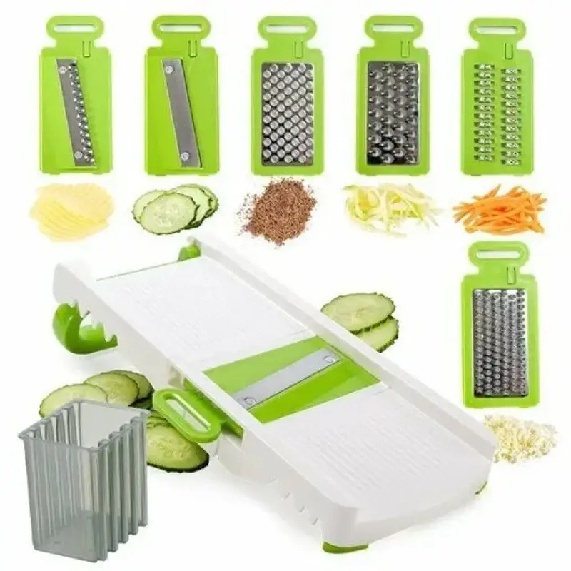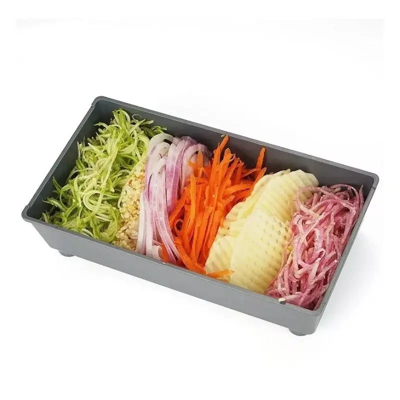 Fácil de usar: la cortadora está equipada con una base de contenedor de alimentos antideslizante, que puede almacenar las verduras y frutas cortadas en categorías, reduciendo el desorden en la tabla de cortar de la cocina, de modo que a veces ni siquiera necesita una tabla de cortar.