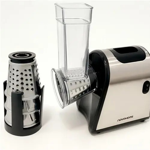 RALLADOR ELECTRICO NOVOHOME SKU: NH-SM219 ¡Lleva tus habilidades culinarias al siguiente nivel con este rallador eléctrico de alta potencia! Con una impresionante potencia de 250 W y un voltaje de 220-240 V este rallador está listo para hacer el trabajo pesado en tu cocina de manera rápida y eficiente. Versatilidad imbatible: Equipado con 3 conos de corte especializados. Sin importar la textura que necesites, este rallador lo hace posible con precisión y rapidez. Diseño elegante y duradero: Su cuerpo de acero inoxidable no solo le proporciona una apariencia moderna y sofisticada, sino que también garantiza resistencia y durabilidad, asegurando que tu inversión sea a largo plazo. Organización perfecta: Viene con un práctico estante para almacenar los conos de corte y un empujador de alimentos, manteniendo tu cocina ordenada y tus herramientas siempre a mano. Fácil de limpiar: Olvídate de las complicaciones de la limpieza. Este rallador está diseñado para ser sencillo de desmontar y limpiar, ahorrándote tiempo y esfuerzo después de cada uso. Operación sencilla: Con un cómodo interruptor de encendido/apagado, su uso es tan fácil como un solo toque. Especificaciones técnicas: