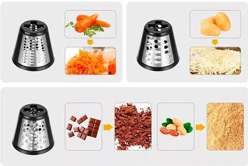 - 3 Conos de corte: Cortador grueso, Cortador fino, Rallador grueso, Rallador fino, Picador