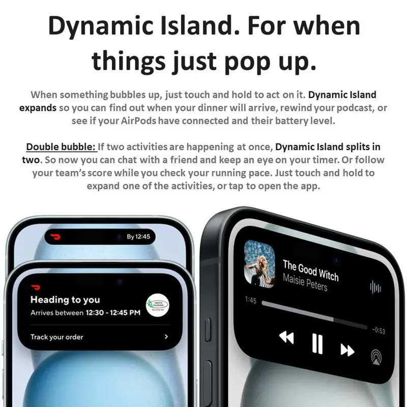 - Isla dinámica. Una forma mágica de interactuar con el iPhone. Chip A16 Bionic con GPU de 5 núcleos