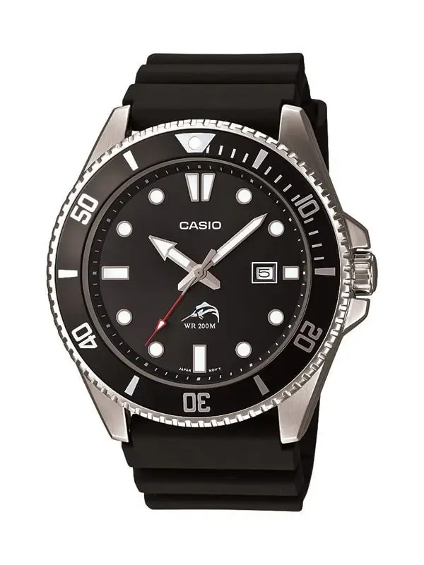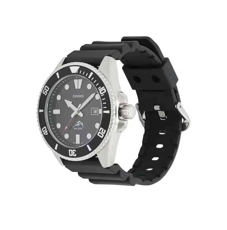 Descripción del producto Inspirada en el mar, esta correa de resina negra y su caja de acero inoxidable le dan un aspecto clásico, mientras que su bisel antirreverso añade una funcionalidad de buceo clásica. Sencillo analógico de 3 manecillas con pantalla de fecha para facilitar la lectura. Reloj analógico con correa de resina negra y esfera en blanco y negro. Historia de la marca Casio Con el lanzamiento de su primer reloj en noviembre de 1974, Casio entró en el mercado de los relojes de pulsera en un momento en que la industria relojera acababa de descubrir la tecnología digital. Como empresa con tecnología electrónica de vanguardia desarrollada para calculadoras de bolsillo, Casio entró en este campo con la confianza de poder desarrollar relojes que lideraran el mercado. En la actualidad, Casio centra sus esfuerzos en relojes controlados por radio que funcionan con energía solar: la batería solar integrada elimina la molestia de reemplazar las baterías y el cronometraje atómico significa que los usuarios nunca tienen que restablecer la hora. Recientemente, Casio lanzó una serie de relojes Bluetooth que se sincronizan con el teléfono celular del usuario para actualizar automáticamente la hora. Casio siempre hace avanzar el tiempo. Del fabricante Este reloj Casio Sea con iluminación analógica ofrece toda la comodidad y durabilidad de un reloj deportivo, con un estilo adaptable ideal para un día de trabajo. La gran esfera redonda es negra con índices blancos y luminosos, dos manecillas luminosas y un segundero rojo con punta de flecha. El bisel negro de acero inoxidable ofrece índices de puntos y números arábigos adicionales y una rotación unidireccional para facilitar el cronometraje. El distintivo borde en forma de engranaje del bisel también le da al reloj un elegante toque industrial. La fecha se muestra sutilmente a las tres en punto. La correa está hecha de resina negra resistente con un cierre de hebilla. Este reloj analógico que funciona con cuarzo es resistente al agua hasta 660 pies (200 metros) y ofrece una duración de la batería de aproximadamente tres años.