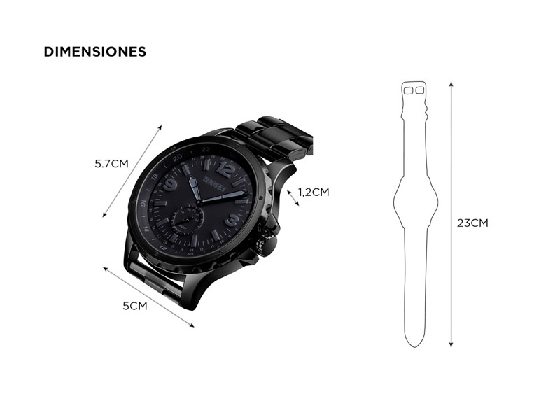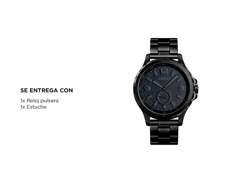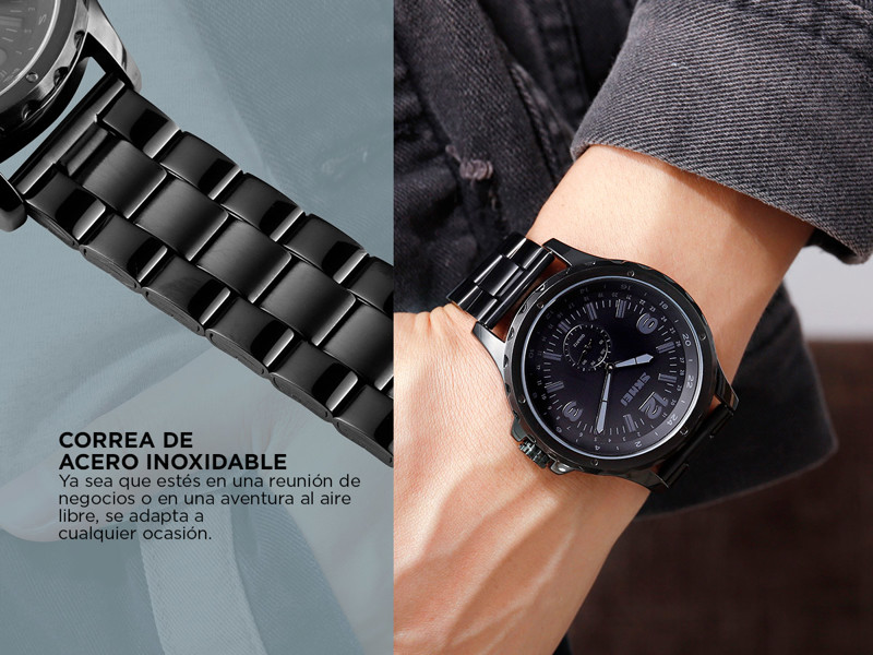 Este reloj cuenta con una correa de acero inoxidable negra que brinda durabilidad y un aspecto sofisticado. Ya sea que estés en una reunión de negocios o en una aventura al aire libre, este reloj se adapta a cualquier ocasión con su elegancia atemporal.