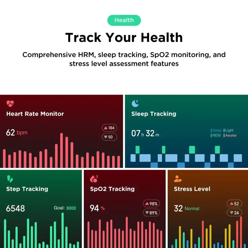 - Monitoreo avanzado de la salud: manténgase al tanto de su salud con funciones de seguimiento integrales que incluyen frecuencia cardíaca, SpO2 y monitoreo del estrés, que le proporciona información valiosa para mantener su bienestar.