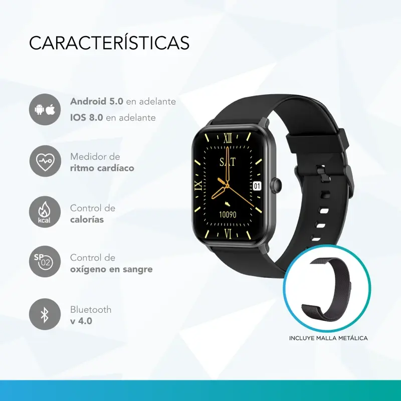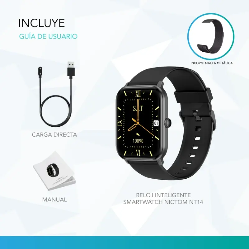 Nictom Tienda OficialEl SmartWatch NT15 tiene una pantalla de 1,75? y resistente al agua. Sincronizado con tu celular, vas a poder recibir notificaciones de mensajes, controlar la cámara y la música de tu Smartphone.Características:- Resistente al agua: IP68- Tipo de Alerta: Vibración- Despertador- Calendario- Seguimiento de ritmo cardíaco- Seguimiento del sueño- Notificación de mensajes- Cronómetro- Notificación de llamadas- Monitor del oxígeno en sangre- Tamaño de Pantalla: 1,75"- Resolución de pantalla: 240 x 240 px- Tipo de Pantalla: TFT táctil- Batería: 200 mAh- Método de carga: Carga magnética- Malla Metálica Negra- Bluetooth 5.0- Compatible con Android 5.1 / iOS 9.0 y superior