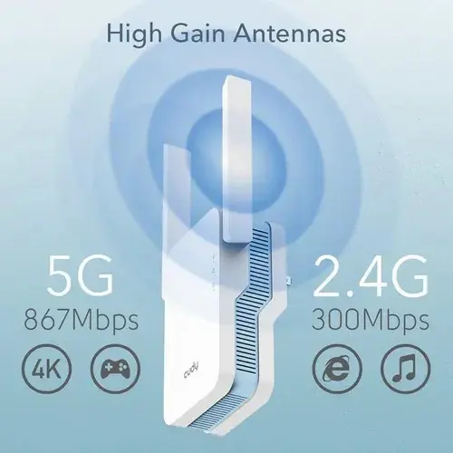 REPETIDOR EXTENSOR DE RANGO WI-FI MESH AC1200 CUDY RE1200 Extensor WiFi con velocidades WiFi de 1.2Gbps. El Wi-Fi de 2.4 GHz alcanza una velocidad de 300 Mbps, perfecto para enviar correos electrónicos, navegar por la web y escuchar música. La banda Wi-Fi cristalina de 5 GHz alcanza tp 867 Mbps para que puedas jugar en línea y transmitir en HD simultáneamente. Aumenta la cobertura de tu router WiFi. 2 antenas externas de alta ganancia aumentan el rango de la red WiFi existente, amplían la cobertura Wi-Fi de 2.4 GHz y 5 GHz, eliminan las zonas muertas de WiFi. Conecta más de 30 dispositivos. El soporte WiFi de doble banda AC1200 conecta más de 30 dispositivos WiFi, el puerto Gigabit Ethernet permite que el extensor WiFi funcione como un puente multimedia para conectar dispositivos con cable como PC, reproductor multimedia, consola de juegos y TV inteligente. Fácil configuración y colocación flexible. Presione el botón WPS en su router y su RE1200 para conectarse fácilmente a la red. Una vez conectado con un enrutador existente, simplemente puedes conectar Cudy RE1200 en una ubicación para la mejor calidad de señal y cobertura en tu casa, sin necesidad de configurar el extensor nuevamente. Extensor WiFi 2 en 1punto de acceso. Los modos de trabajo múltiples proporcionan la máxima flexibilidad de uso. El modo extensor de alcance ayuda a ampliar su cobertura Wi-Fi, mientras que el modo de punto de acceso transforma su red cableada existente en una inalámbrica. CARACTERISTICAS