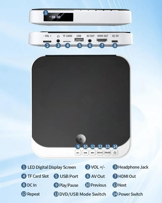 - ?Minireproductores de DVD para TV?El reproductor de DVD DESOBRY es mucho más pequeño que los reproductores de DVD normales, mide solo 6,1 x 5,9 x 1,2 pulgadas y 1,1 libras, ahorra más espacio y es fácil de transportar. El mando a distancia con todas las funciones suministrado también es fácil de usar para niños y personas mayores.