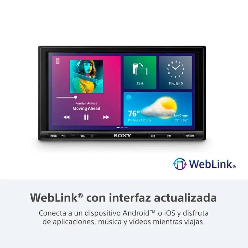 Una pantalla táctil antirreflectante de 17.1 cm (6.75 pulgadas) con duplicación del smartphone mediante WebLink® que se opera con dispositivos Android y iOS, y tiene una instalación sencilla con chasis posterior de un solo DIN.