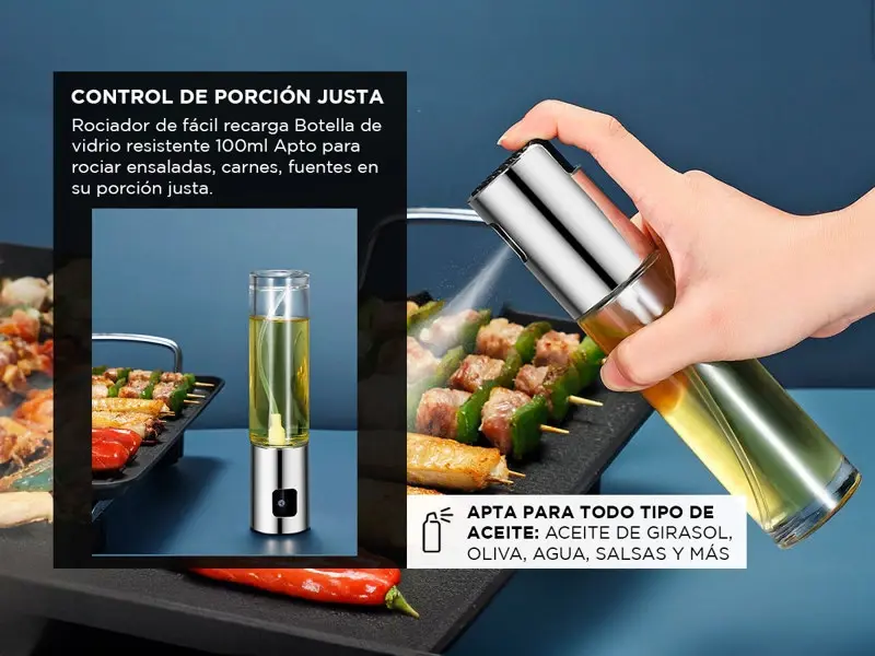 El Spray de Aceite Gadnic es un accesorio esencial para tu cocina, diseñado para facilitar la aplicación uniforme de aceites en tus preparaciones culinarias. Con su diseño elegante y moderno, este spray es tanto funcional como estéticamente agradable.