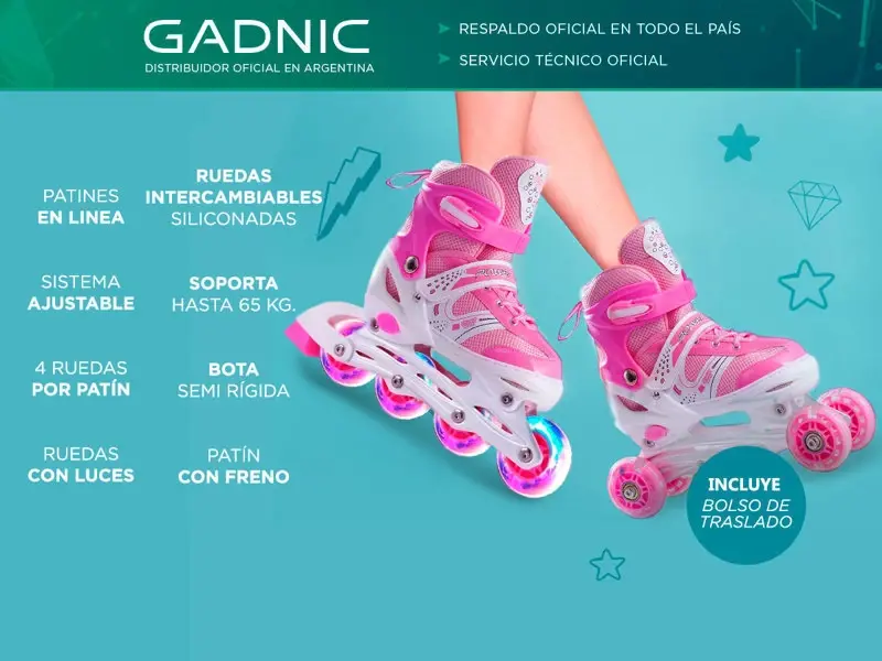 ¡Nuevos Rollers Para Niños y Niñas Extensibles Gadnic! Es un Roller en linea (con 4 ruedas rectas) que se entrega con un set de herramientas y se da la posibilidad de cambiar las ruedas de lugar para transformar el roller en patin. Lo cual hace mucho mas facil el poder usarlos y no necesitas nada mas de lo que incluye el kit. Es ideal para los mas chicos cuando recién comienzan Es decir lo podes usar tipo roller o tipo Patin.