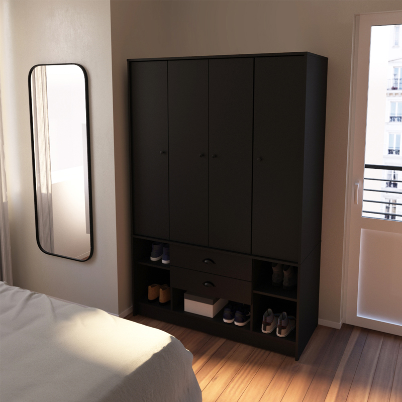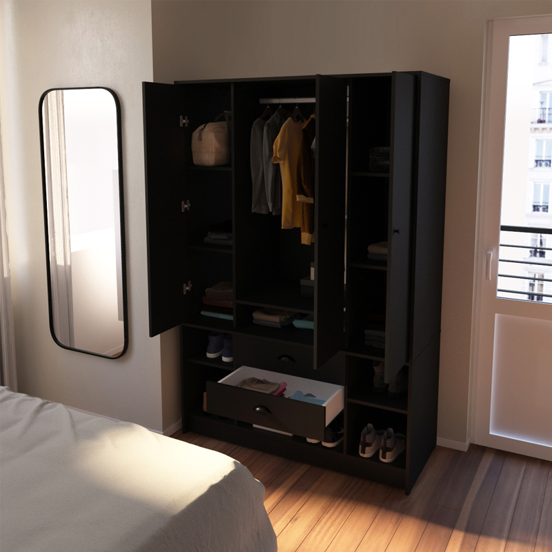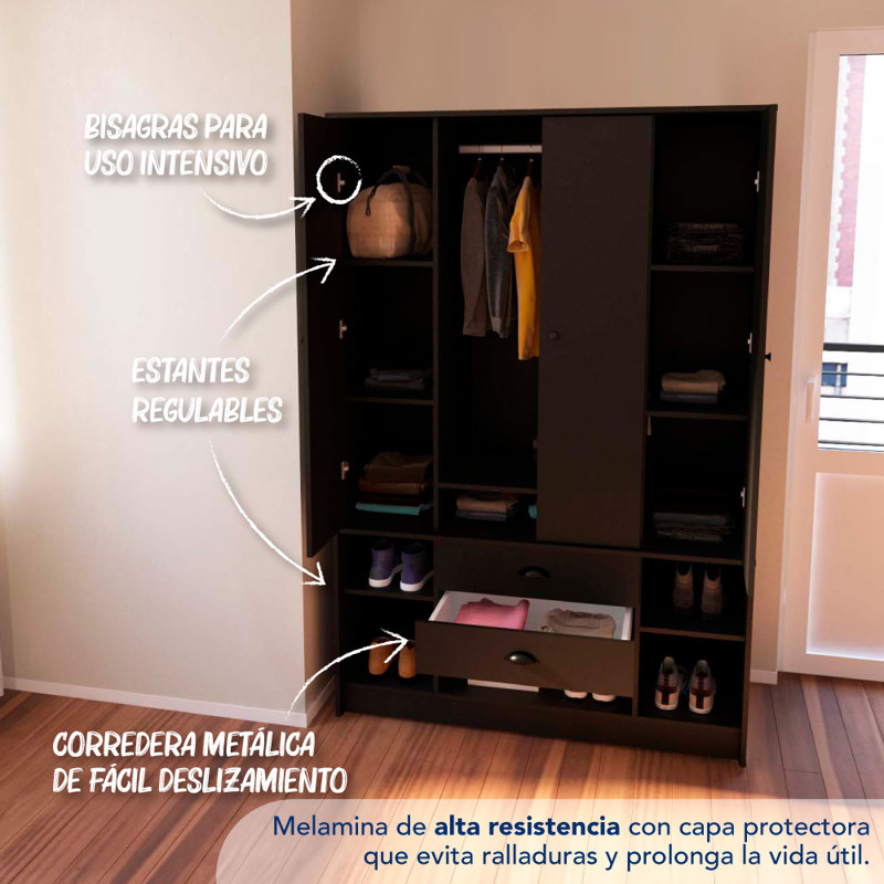 CENTRO ESTANT ROPERO LIBE 40 NEGRO SKU: LIBE40N Ropero clásico de cuatro puertas. Pensado con dos secciones de estantes regulables y, en el centro, un perchero para prendas de colgado. En su parte inferior, dos cajones y un espacio para guardar el calzado. Ideal para compartir. CARACTERISTICAS Peso embalaje: 96,6 kg Dimensiones embalaje: 123,8 × 51 × 26,6 cm Colores- Textura: Negro Material: Melamina Alto del mueble (cm): 180 Ancho del mueble (cm): 120 Profundidad del mueble (cm): 50 Peso del mueble (kg): 96.6 Puertas: 4 Cajones: 2 Correderas: Metálica Estantes Fijos: 3 Estantes Regulables: 4 Línea: Libe Ambiente: Dormitorio 24 MESES DE GARANTIA CON LA MARCA
