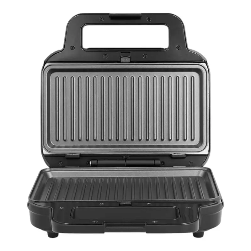 - Con su estructura resistente en acero y negro elegante, esta sandwichera se convierte en el aliado ideal para crear tus snacks favoritos en minutos.