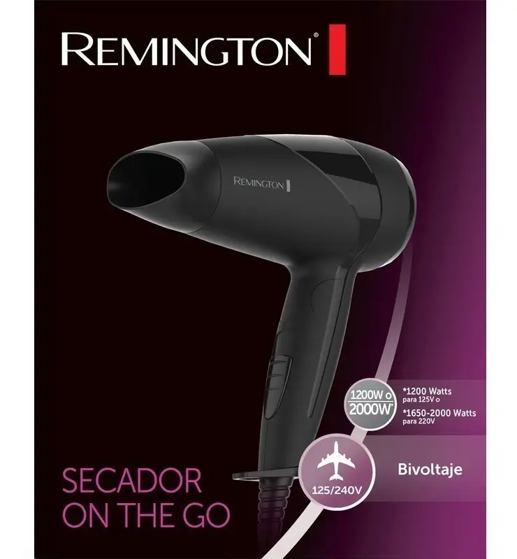 Secador Pelo Cabello Viaje 2000 watts Bivoltaje - RemingtonModelo: D1500(BV)ACaracterísticas:• 2000 watts en 240V• 1200 watts en 120V• 2 temperaturas / velocidades• Bivoltaje• Concentrador• Mango plegable• Gancho para colgar• Filtro removible• Motor AC: No• Función Frío: No• Boquilla Concentradora: Si• Velocidades: 2• Niveles de Temperatura: 2• Función Ion: No************************************************************************72 horas de prueba con nosotros24 meses de garantía con la marca