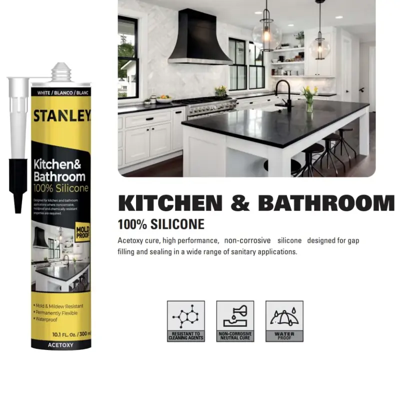 - Diseño de producto: el calafateo de silicona permanece flexible después del curado, lo que permite el movimiento y la expansión sin agrietarse. Esta flexibilidad lo hace ideal para áreas que experimentan cambios de temperatura o movimientos estructurales.