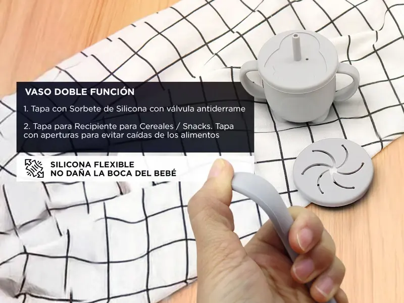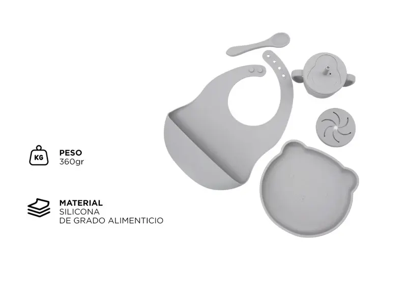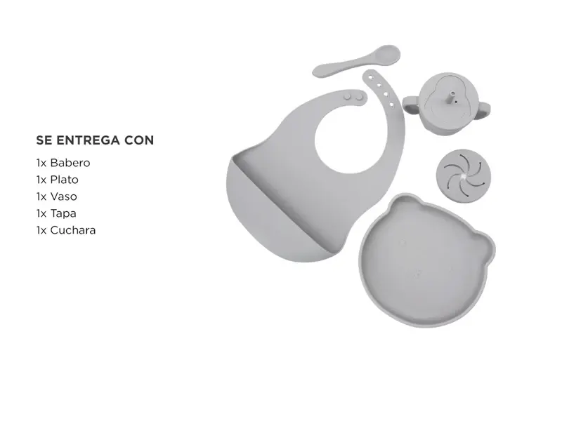 Hecho de silicona de grado alimenticio, este set está compuesto por un plato con divisiones y base de succión fuerte, un babero ajustable con recojemigas, un vaso de silicona de doble función y cubiertos ergonómicos. Pensado para facilitar la experiencia de alimentación de los más pequeños, cada componente del set está diseñado para resistir el uso diario, ofrecer comodidad y proteger la ropa del bebé de derrames accidentales.