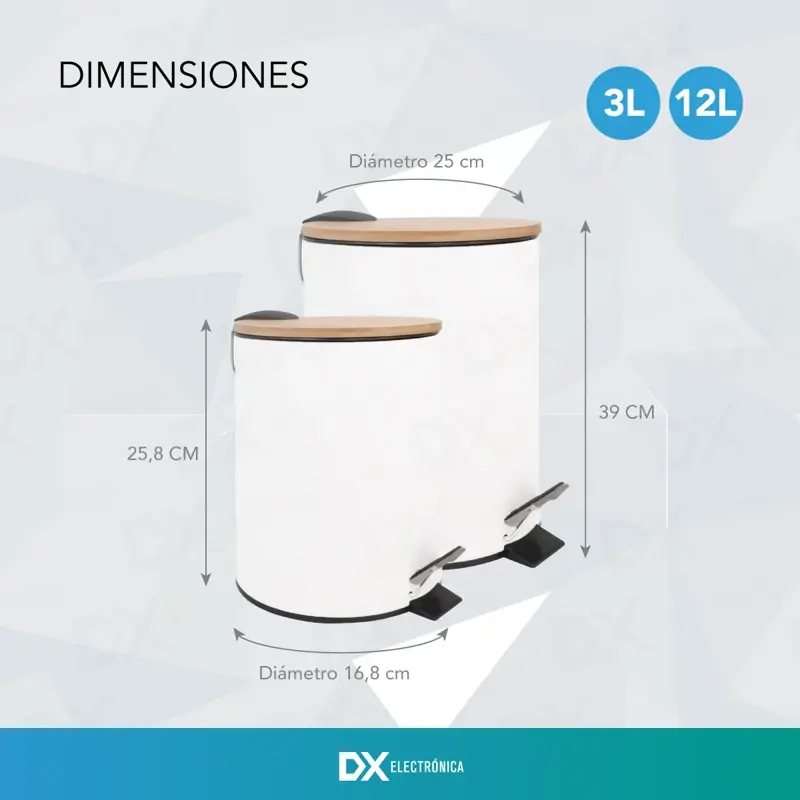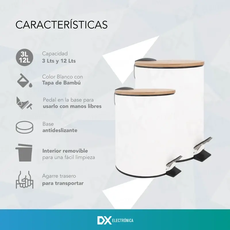 La línea de tachos de basura de @somosnictom cuentan con la mejor combinación entre funcionalidad y diseño. Este set incluye un tacho de basura blanco con tapa de bambú con una capacidad de 3 Lts, más un tacho de basura blanco con tapa de bambú con una capacidad de 12 Lts.CARACTERÍSTICASESPECIFICACIONES TACHO DE BASURA:Capacidad: 3 Lts y 12 LtsPedal en la base para usarlo con manos libresBase antideslizanteInterior removible para una fácil limpiezaAgarre trasero para transportarMecanismo de apertura durable y resistenteColor Blanco con Tapa de BambúMedidas Tacho de Basura 3 Lts:Diámetro: 16,8 cmAlto: 25,8 cmMedidas Tacho de Basura 12 Lts:Diámetro: 25 cmAlto 39 cm