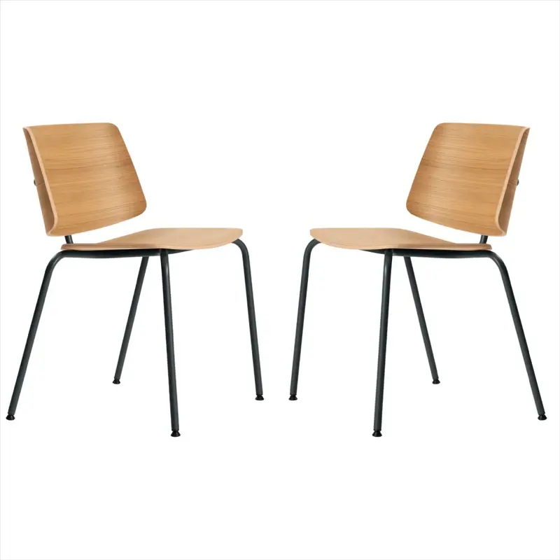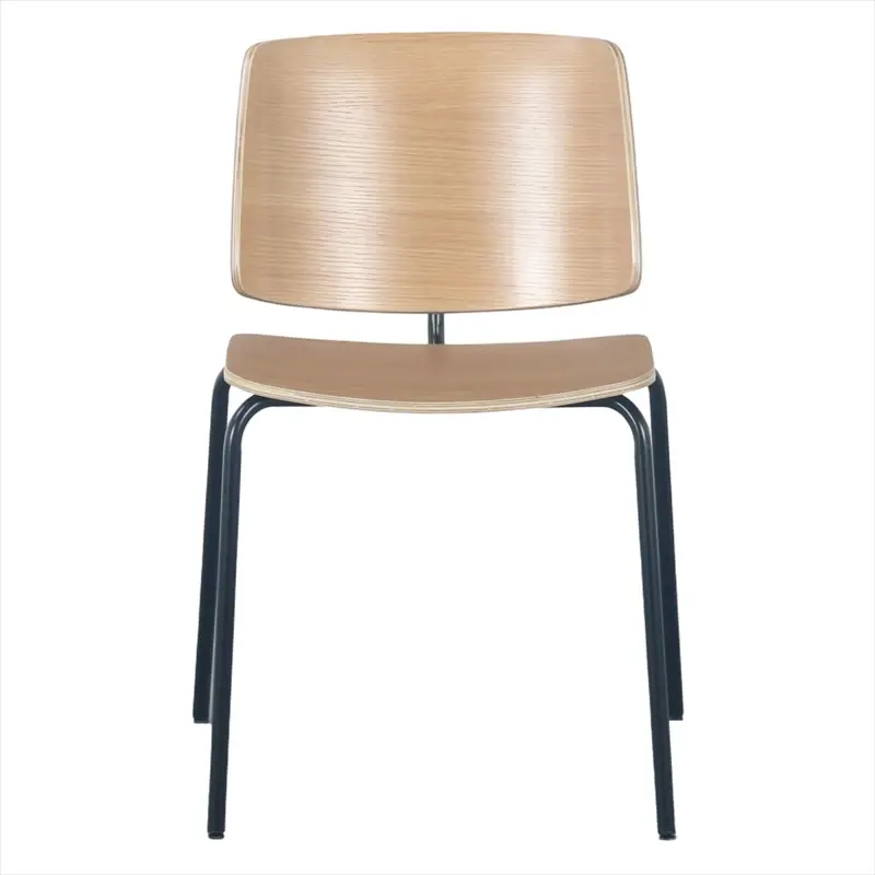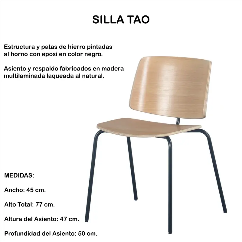 Estructura y patas de hierro pintadas al horno con epoxi en color negro. Asiento y respaldo fabricados en madera multilaminada laqueada al natural.