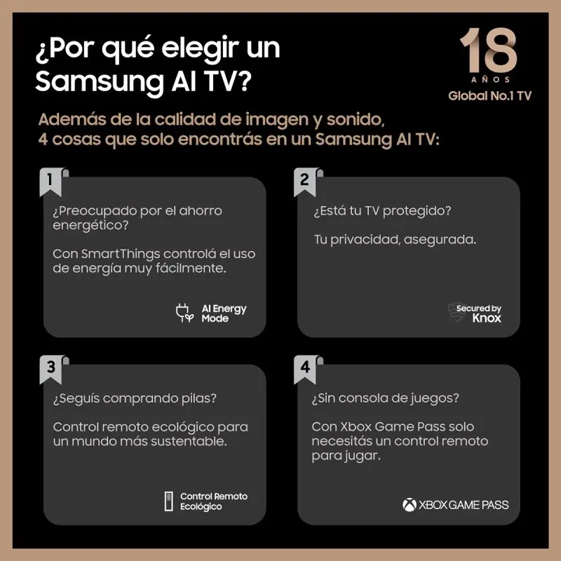 - Sistema operativo: Tizen# Smart TV. Mejora tu entretenimiento con Samsung Tizen OS