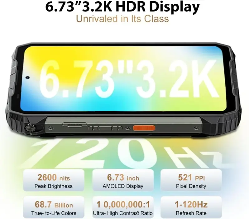 The unlocked Blackview XPLORE 2 Project rugged phone is equipped with a 6.78-inch FHD+ Corning Gorilla Glass 5 display with an ultra-clear 1440 x 3200 resolution. Combined with a high 120Hz refresh rate, it delivers a smooth experience whether you're quickly scrolling through pages or playing high-frame-rate games. Its ultra-bright mode reaches up to 500 nits, ensuring clear readability even in bright sunlight.