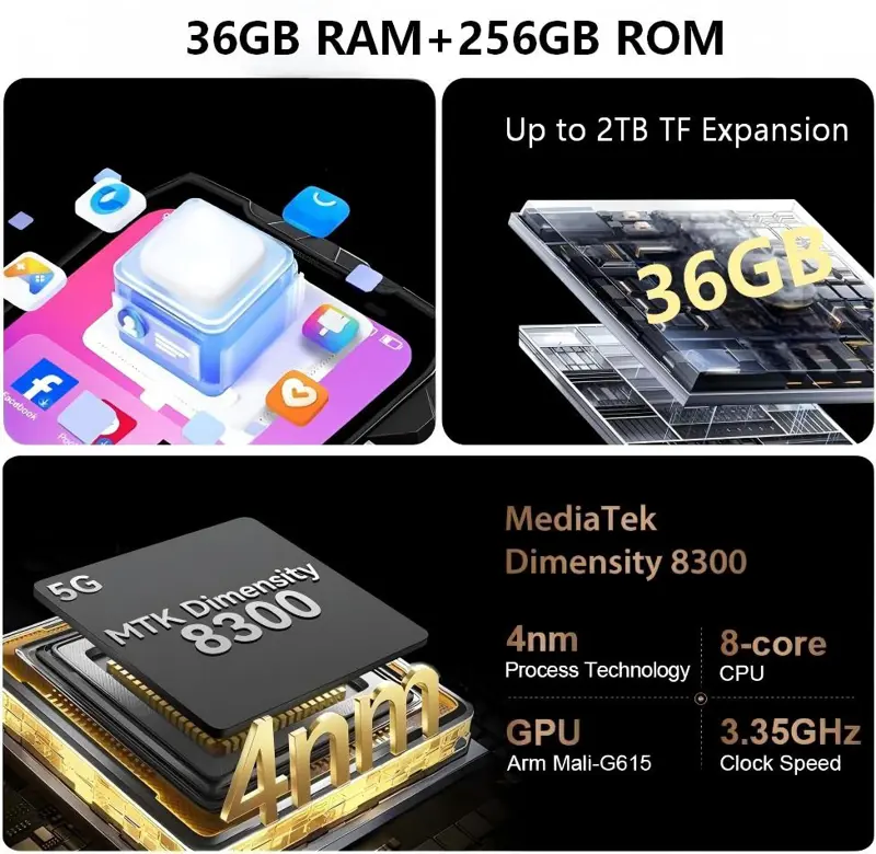 The Blackview XPLORE 2 projector phone boasts 36GB of RAM and 256GB of internal storage, expandable up to 2TB, offering ample space for all your apps, photos, videos, and files. Running the latest Android 15, it delivers a smarter, smoother, and more personalized user experience. With the MediaTek Dimensity 8300 processor built on a 4nm process, it handles everyday tasks and multimedia entertainment with enhanced efficiency. Enjoy a significant boost in both CPU and GPU performance, and experience seamless streaming and gaming thanks to its octa-core CPU reaching speeds up to 3.35GHz.
