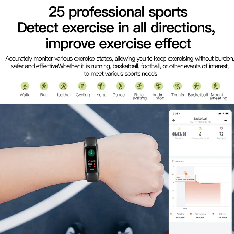 Especificaciones Generales: Pantalla: AMOLED a color de 1.1 pulgadas Conectividad: Bluetooth 5.0 Idiomas soportados: Español, Inglés, Francés, Alemán, Italiano, Japonés, Chino simplificado. Colores de correa disponibles: Negro, Rosa, Rojo Vino, Lila (Púrpura claro), Gris. Materiales y Construcción: Material de la carcasa: PC + ABS (Plástico de alta resistencia) Material de la correa: Silicona compuesta TPU (suave y resistente) Resistencia al agua: Nivel 3ATM (Resistente a salpicaduras, lluvia y sudor) Operación: Táctil Batería y Carga: Capacidad de batería: 90 mA Método de carga: Carga magnética Dimensiones y Peso: Tamaño del dispositivo (reloj): 4.4 cm (largo) x 1.9 cm (ancho) x 1.1 cm (grosor) Circunferencia de muñeca: Ajustable entre 13 cm y 21.5 cm Funciones Principales Salud y Bienestar: Monitoreo de frecuencia cardíaca (Heart rate) Medición de oxígeno en sangre (Blood oxygen) Presión arterial (Blood pressure) Monitoreo del sueño (Sleep monitoring) Recordatorio de sedentarismo Deporte y Actividad: Modos de ejercicio Podómetro (pasos) Utilidades Diarias: Notificaciones de mensajes y llamadas (Information reminder) Alarma / Despertador Encendido automático de pantalla al girar la muñeca Control remoto de cámara Esferas de reloj personalizables (Custom dial) Temporizador (Timer) Modo "No molestar" ¿Qué incluye la caja? 1x Pulsera inteligente (Smart Bracelet) 1x Correa de muñeca 1x Cable de carga magnético 1x Manual de usuario