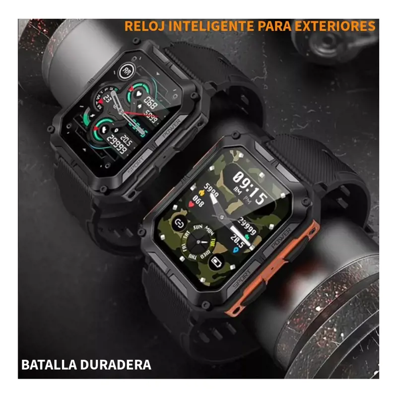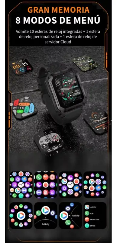 * El smartwatch ultra premium puede reproducir la musica de tu celul directo desde el altavoz del reloj, ideal para comprartir incluso hasta los audios de whatsapp que puedes reproducir en el reloj. Tambien permite recibir y realizar llamadas telefonicas desde el reloj !!!! Es un modelo que destaca a simple vista por su cuerpo robusto y por contener múltiples idiomas entre los que encontras el castellano. Es un reloj con estándares militares, por lo que tendremos a disposición un reloj inteligente de una resistencia excepcional, excelente para quienes hacen deportes o actividades que supongan mucho roce para el reloj. Cabe destacar que tiene certificación ip67 que protege contra sudor, lluvia al entrenar al aire libre, lavado de manos o cualquier contacto ocasional con el agua fria como por ejemplo ir de pesca.