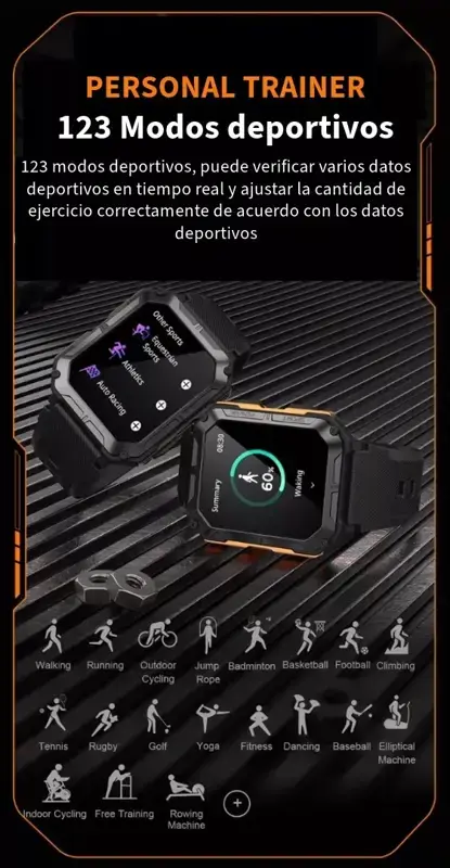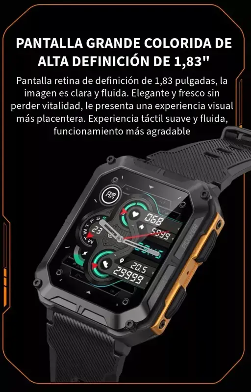* El smartwatch ultra premium puede reproducir la musica de tu celul directo desde el altavoz del reloj, ideal para comprartir incluso hasta los audios de whatsapp que puedes reproducir en el reloj. Tambien permite recibir y realizar llamadas telefonicas desde el reloj !!!! Es un modelo que destaca a simple vista por su cuerpo robusto y por contener múltiples idiomas entre los que encontras el castellano. Es un reloj con estándares militares, por lo que tendremos a disposición un reloj inteligente de una resistencia excepcional, excelente para quienes hacen deportes o actividades que supongan mucho roce para el reloj. Cabe destacar que tiene certificación ip67 que protege contra sudor, lluvia al entrenar al aire libre, lavado de manos o cualquier contacto ocasional con el agua fria como por ejemplo ir de pesca.