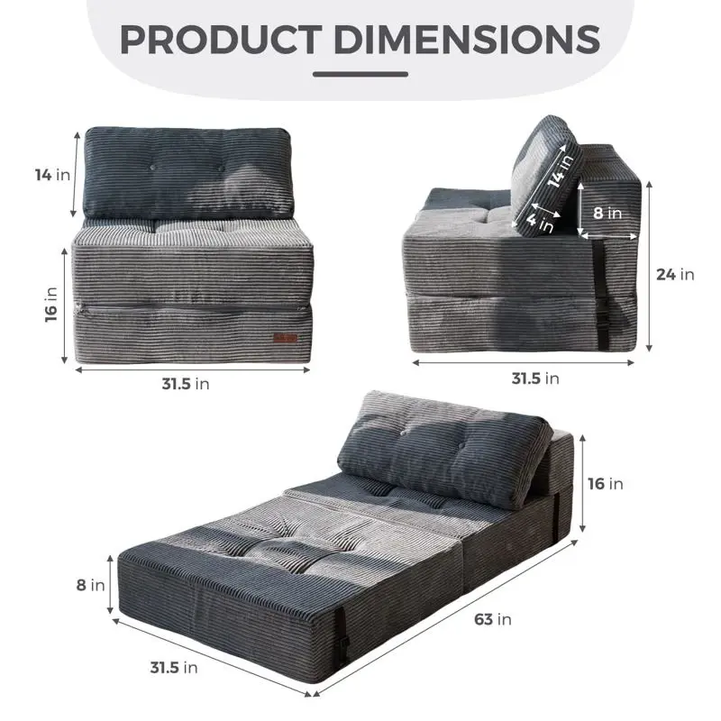 - Nota: las dimensiones de este sofá cama son 63"x31.5"x16". Este sofá cama plegable es de compresión al vacío, abre el paquete en un lugar bien ventilado y espera 48 horas para obtener la experiencia de expansión, de nuevo a un tamaño cómodo