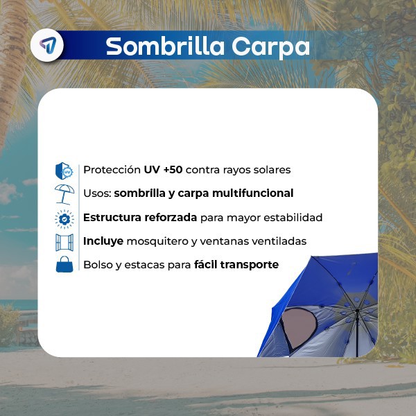 ¡Lleva tu aventura al siguiente nivel con la sombrilla carpa más completa y funcional del mercado! Diseñada para ofrecer protección, comodidad y versatilidad, esta carpa playera se adapta a tus necesidades, ideal para playa, picnic o camping. Confeccionada en tela Oxford 210 resistente al viento, al agua y con protección UV +50, cuida tu piel mientras disfrutas del aire libre. Su estructura reforzada de acero, varillas resistentes, estacas y correas garantizan estabilidad incluso en condiciones de viento. Además, es ligera y portátil, pesando solo 3 kg e incluye un bolso de transporte. Usala como sombrilla de 240 cm de altura y 220 cm de diámetro o como carpa de 140 cm de altura y 270 cm de largo. Con accesorios funcionales como estacas de plástico y acero, sogas de viento y un mosquitero, es la opción perfecta para disfrutar al máximo de tus días al aire libre. ¡Haz que cada momento sea inolvidable!
